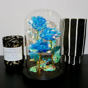This rose was born not in a greenhouse, but in a universe you built for her. Deep blue petals, dusted with silver like distant constellations. A single, perfect bloom, suspended under glass—untouched by time, unchanged by weather, unbothered by the ordinary decay that claims every flower she has ever been given.